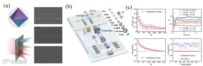 研究团队设计了可对量子态进行广义测量的光学超表面,可以同时将光子偏振状态展开到信息完备测量基矢上,并将六束光分解到不同的空间通道进行探测。利用此超表面的八面体广义测量进行了阴影层析实验,仅需要几百毫秒就可以实现偏振态投影算符的期望值估计(如图4所示)。