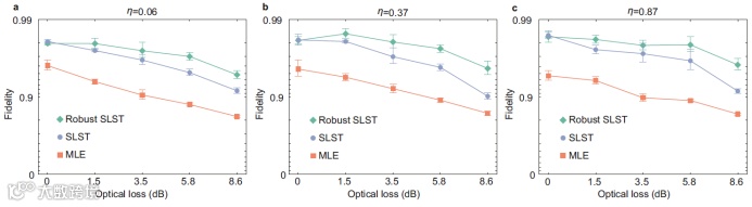 研究团队还提出了一种自学习阴影层析技术(SLST),结合同步扰动随机逼近算法(SPSA),用阴影层析对弗罗贝尼乌斯范数进行无偏估计并作为损失函数,再用SPSA对描述量子态的参数做全局优化进行量子态重构。实验结果表明,在同样的采样数目下,SLST以较小的经典迭代次数达到更高的精度,可以有效降低重构量子态所需要的样本复杂度的后处理复杂度,并且具有抗噪声的优点(如图5所示)。