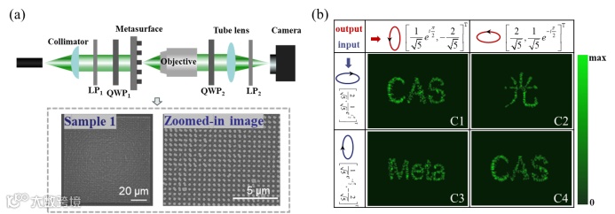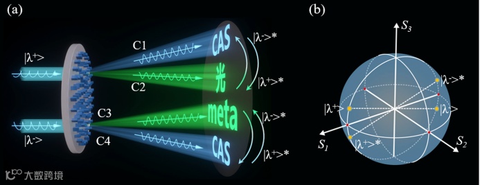 研究团队在揭示偏振光与介质纳米柱作用过程中自旋轨道耦合机制的基础上,引入新的偏振转化因子项,构建了超表面广义相位调控框架,可以实现多通道任意偏振态相位的独立控制和不同通道间能量的任意分配。框架原理示意图如图1所示,任一偏振态的光可以被超表面转化成复共轭态和正交复共轭态两部分,这两部分光场的相位和能量可以进行独立的控制。