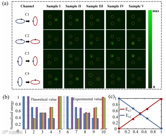 此外,基于该理论设计了一系列不同偏振转化因子的超表面,不同偏振通道编码信息对应同一个圆周上不同位置的聚焦点,通过偏振态的选择可以将能量聚焦到不同位置,如图3所示。结果显示随着转化因子的变化,不同通道的能量也相应发生改变。因此,通过改变偏振转化因子实现了不同通道间能量的精确控制。综上,该理论适用于任意偏振态相位的独立控制和不同偏振通道间能量的任意分配。