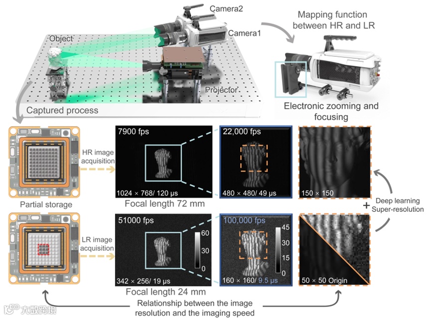 近年来,随着人工智能,特别是深度学习(Deep Learning, DL)的迅猛发展,光学计量学也迎来了范式转变。深度学习结合彩色条纹、几何约束及频域复用等技术,已经能够在单帧(即图像传感器帧率上限)条件下实现无歧义的高精度三维成像。然而,现有高速摄像机在较高分辨率下的成像帧率通常仅能达到几千赫兹,且对成像信噪比要求较高。因此,目前所报道的FPP技术最高实现的三维成像帧率仅达到~ 20 kHz,仍无法满足捕捉超快动态现象的需求。进一步提升成像帧率面临像素分辨率下降(受限于读出带宽)及图像信噪比急剧降低(曝光时间缩短)的双重挑战。因此,如何实现“高分辨、快帧频、高信噪比”探测是当前亟待解决的重要问题。