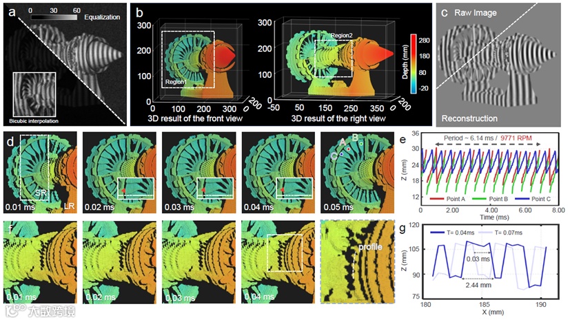 此外,研究团队使用这项技术对每分钟约9771转的涡扇发动机模型实现了动态测量,如图4所示,从两个不同的角度展示了对涡扇发动机模型的三维渲染结果。借助于SSSR-FFP的高时空分辨能力,研究团队提供了以0.01ms为时间间隔的连续三维测量结果,可清晰捕捉到运转齿轮在不同时刻的纹理细节。视频1 记录了涡扇发动机模型的动态三维测量结果。相关实验结果进一步巩固了SSSR-FPP在高速动态成像场景下三维重建的鲁棒性和通用性,特别是在具有复杂几何形状和表面反射率的瞬态物体场景下。