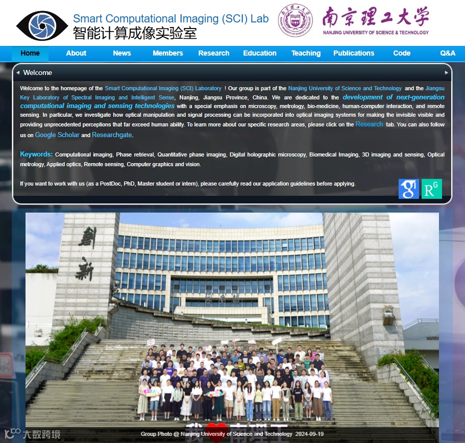 南京理工大学智能计算成像实验室(SCILab: www.scilaboratory.com)隶属于南京理工大学光学工程国家一级重点学科带头人陈钱教授领衔的“光谱成像与信息处理”教育部CJ学者创新团队、首批“全国高校黄大年式教师团队”。实验室学术带头人左超教授为教育部CJ学者特聘教授、国际光学工程学会会士(SPIE Fellow)、美国光学学会会士(Optica Fellow)、英国物理学会会士(IOP Fellow),入选科睿唯安全球高被引科学家。实验室致力于研发新一代计算成像与传感技术,在国家重大需求牵引及重点项目支持下开展新型光学成像的机理探索、工程实践以及先进仪器的研制工作,并开拓其在生物医药、智能制造、国防安全等领域的前沿应用。研究成果已在SCI源刊上发表论文260余篇,其中45篇论文被选作Light、Optica、AP、PhotoniX、OEA等期刊封面论文,23篇论文入选ESI高被引/热点论文,论文被引超过18000次。获欧洲物理学会菲涅耳奖(Fresnel Prize)、获中国光学工程学会技术发明奖一等奖、江苏省科学技术奖基础类一等奖、日内瓦国际发明展“特别嘉许金奖”等。培养博士生6人获全国光学工程优秀博士论文/提名奖、2人获国际光学工程学会(SPIE)光学与光子学教育奖学金、5人获中国光学学会王大珩光学奖、10人获Light全国光学博士生学术联赛全国百强。研究生获国家奖学金30余人次,国际会议最佳报告/海报奖40余人次。学生团队获全国“挑战杯”、“互联网+”、“创青春”、“研电赛”金奖/特等奖15次,2023年,获“互联网+”全国总冠军。师生双创事迹得到央视《焦点访谈》、人民网、新华网、光明日报、中国教育电视台等百余家媒体报道,社会辐射影响广泛。
