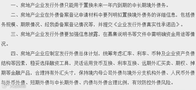 7月12日国家发改委发布《国家发改委办公厅关于对房地产企业发行外债申请备案登记有关要求的通知》(以下简称《通知》)。为防范房地产企业发行外债可能存在的风险,促进房地产市场平稳健康发展,《通知》对房地产企业发行外债申请备案登记提出如下要求: