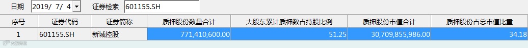 中登数据显示,截至2019年6月28日,新城控股质押股份数量合计7.71亿股,大股东累计质押数占持股比例的51.25%,质押股份市值合计307.1亿元,质押股份占总市值比重的34.18%。