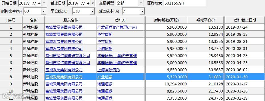 这就意味着,新城控股股价若再下跌20%,部分大股东质押股份就可能面临平仓风险。