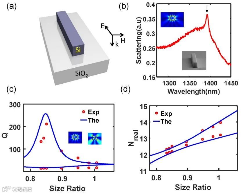 此外,研究团队通过加工硅纳米线并测试其散射谱从实验上证实了这类高Q模式的存在。如图2所示,实验测试结果与理论预测结果吻合的很好,Q因子高达211。
