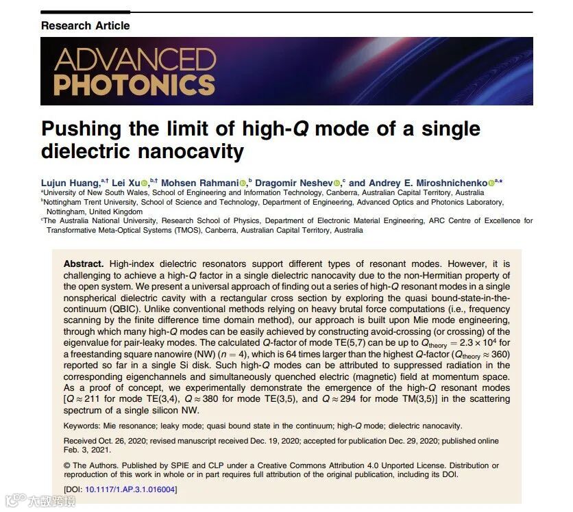 近期,来自新南威尔士大学、诺丁汉特伦特大学和澳大利亚国立大学的联合研究团队提出了一种普适的方法来找出单个介质纳米腔 (比如二维长方形纳米线,三维纳米圆柱和方形柱)的高Q-因子模式。该方法主要是基于米氏模式(又称漏模)调控。相关成果以Pushing the limit of high-Q mode of a single dielectric nanocavity为题发表于Advanced Photonics 2021年第1期。