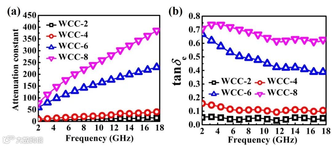 3. 高分散的碳化钨纳米粒子为复合材料创造了丰富的异质界面,有利于强化材料的极化弛豫,进而提高介电损耗能力。