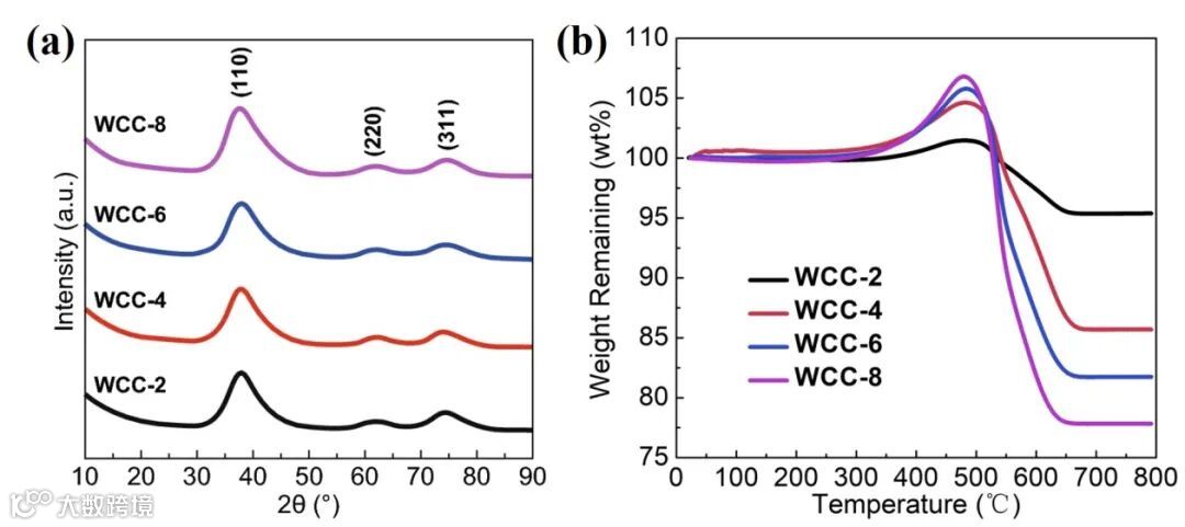 2. 通过改变原料中偏钨酸铵和二氰二胺的比例,可以调变复合材料碳化钨和碳的相对组成,进而调控复合材料的电磁性能。