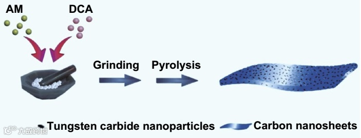 1. 利用简单的固相研磨和高温热解,直接制备了碳化钨/碳的复合材料,其中碳化钨纳米粒子的尺寸约为3~4 nm,均匀分布在碳纳米片表面。