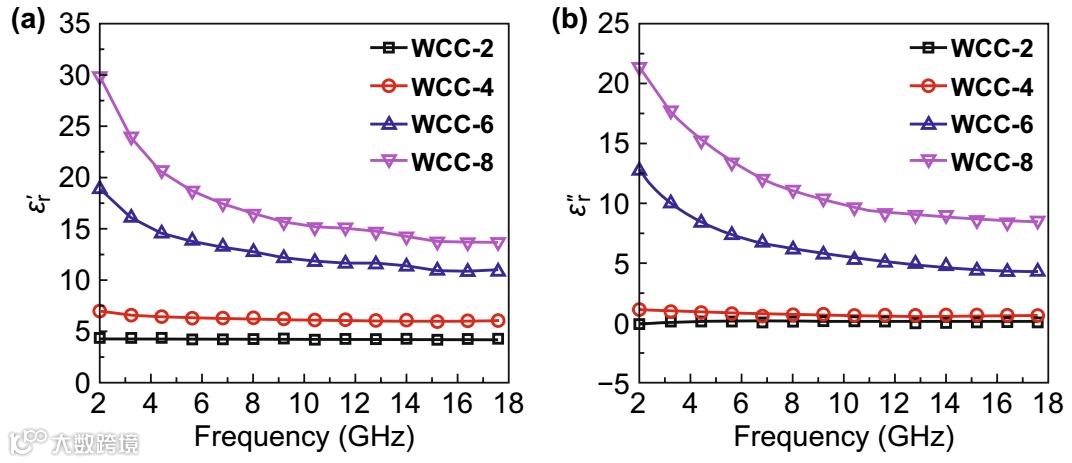 图4. WCC-x复合材料的相对复介电常数(a) 实部和(b) 虚部。