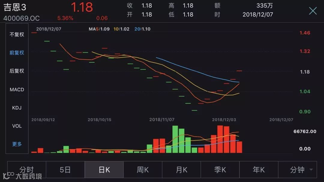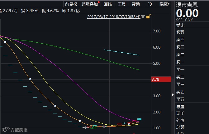 退市吉恩在2018年6月26日开板后,股价从最低的1.02元一路上行,到7月10日股价最高达到1.62元,涨幅高达58.82%。
