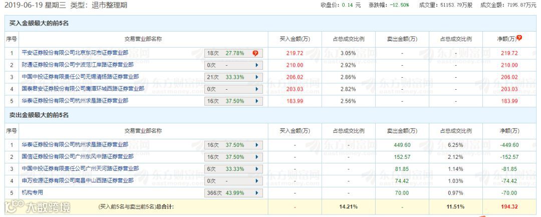 从6月19日的龙虎榜成交额看,退市海润今日获得净买入194.32万元。买入总计1022.76万元,卖出总计828.44万元,龙虎榜买卖成交额均为今年复牌以来最大的一次。