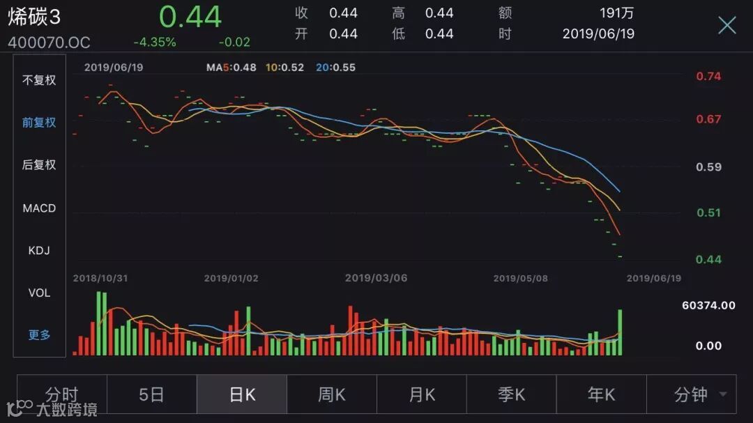 2018年7月退市的烯碳新材在股转系统挂牌后股价持续走低,目前股价仅为0.44元。
