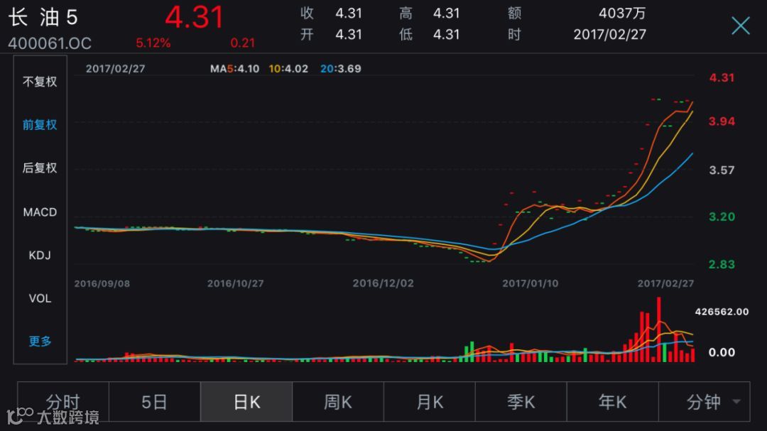 2015年4月20,“长油5”在老三板恢复转让后,连续27个涨停。此后,长油股价连续上涨,至2017年2月27日宣布再次停牌前,创出4.31元/股的新高,与退市时相比暴涨419.28%。