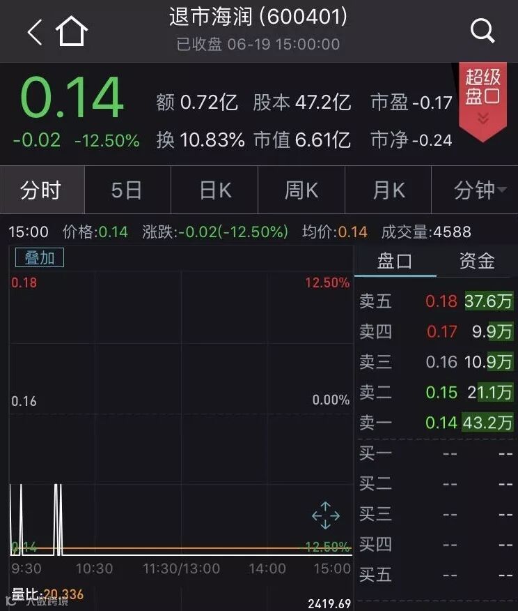 连续20个跌停后,6月19日,退市海润盘中打开跌停,全天成交额达到了7200万元。