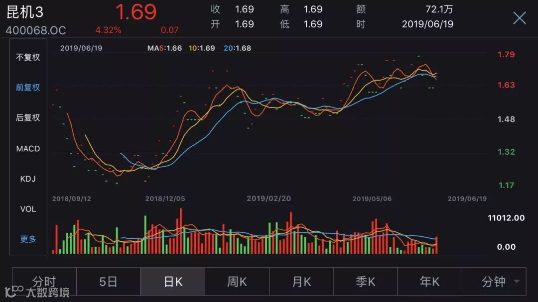 昆明机床退入股转系统后,股价经历前低后高的过程,目前股价仍有1.69元,较挂牌时股价有所上涨。