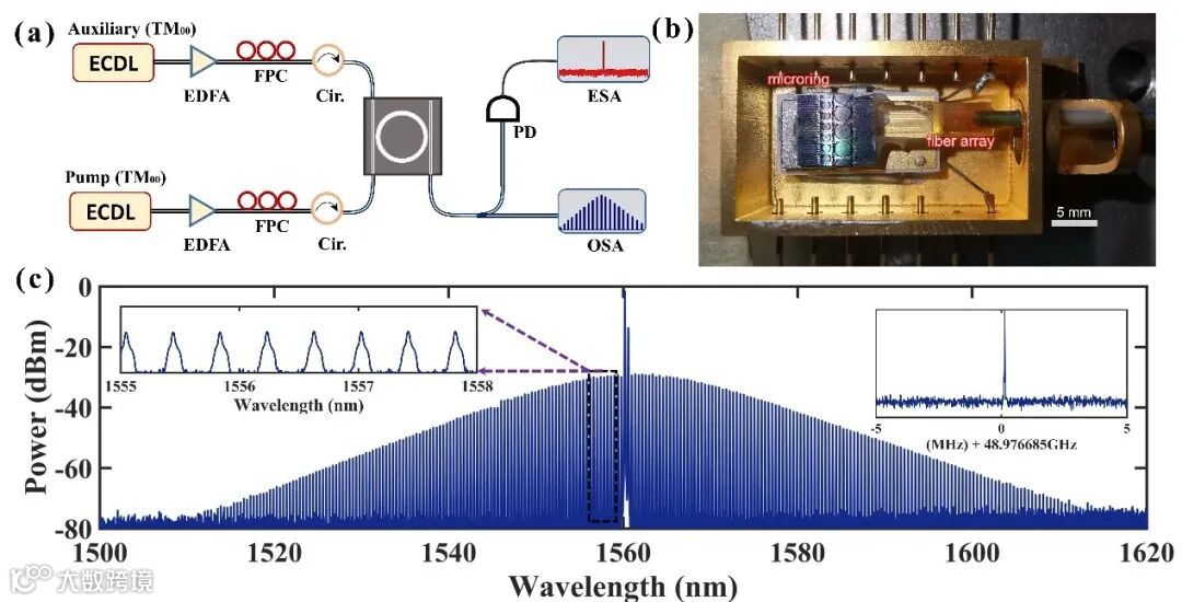 2)针对微腔孤子光频梳环境适应性问题,对微腔芯片进行了高可靠光学封装与TEC(Thermal Electric Cooler,半导体制冷器)温控,开发了程序控制一键自启动微腔孤子光频梳的产生系统,实现了长时间稳定锁模,从而使其适用于户外环境长距离测量;