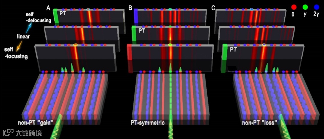 图二 非线性调控的非厄米拓扑态。A-C分别为非PT增益系统、PT对称系统和非PT损耗系统。下半部分为示意图,上半部分为相应的实验结果。上半部分从上至下依次为非线性自散焦self-defocusing(上)、线性linear(中)和非线性自聚焦self-focusing(下)的实验结果。绿色竖框标注的是PT对称态。