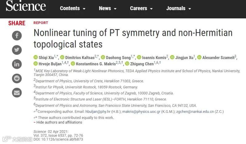 本工作南开大学为第一完成单位,南开大学博士生夏士齐、希腊克里特大学博士生Kaltsas和南开大学副教授宋道红为共同第一作者。南开大学讲席教授陈志刚、南开大学特聘教授/克罗地亚萨格勒布大学教授H. Buljan和希腊克里特大学教授K. Makris为共同通讯作者。合作者还包括德国罗斯托克大学教授A. Szameit等。相关工作得到了国家科技部重点研发计划项目、国家自然科学基金委项目的资助。