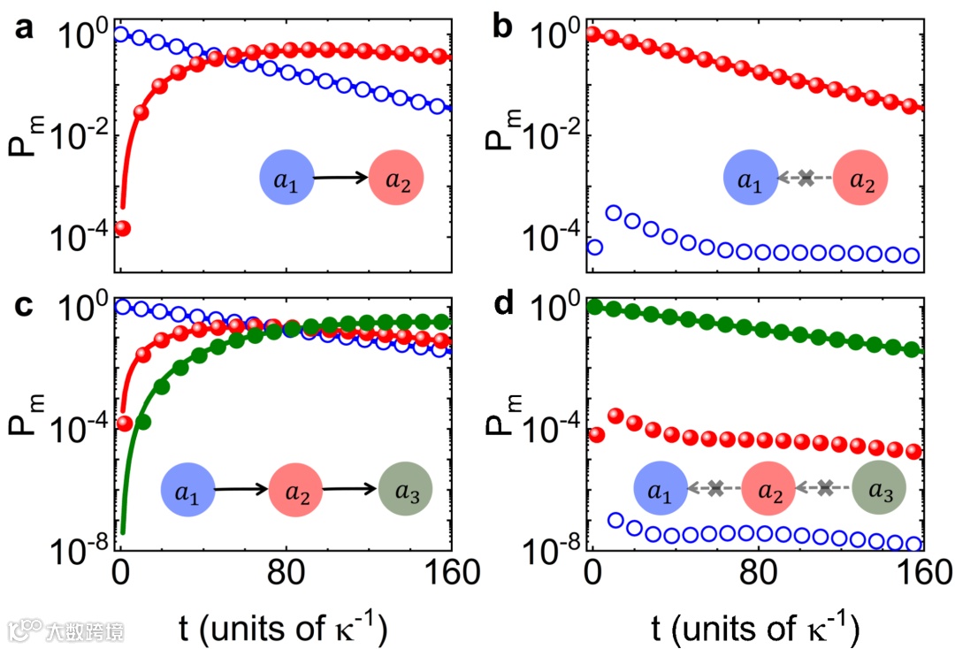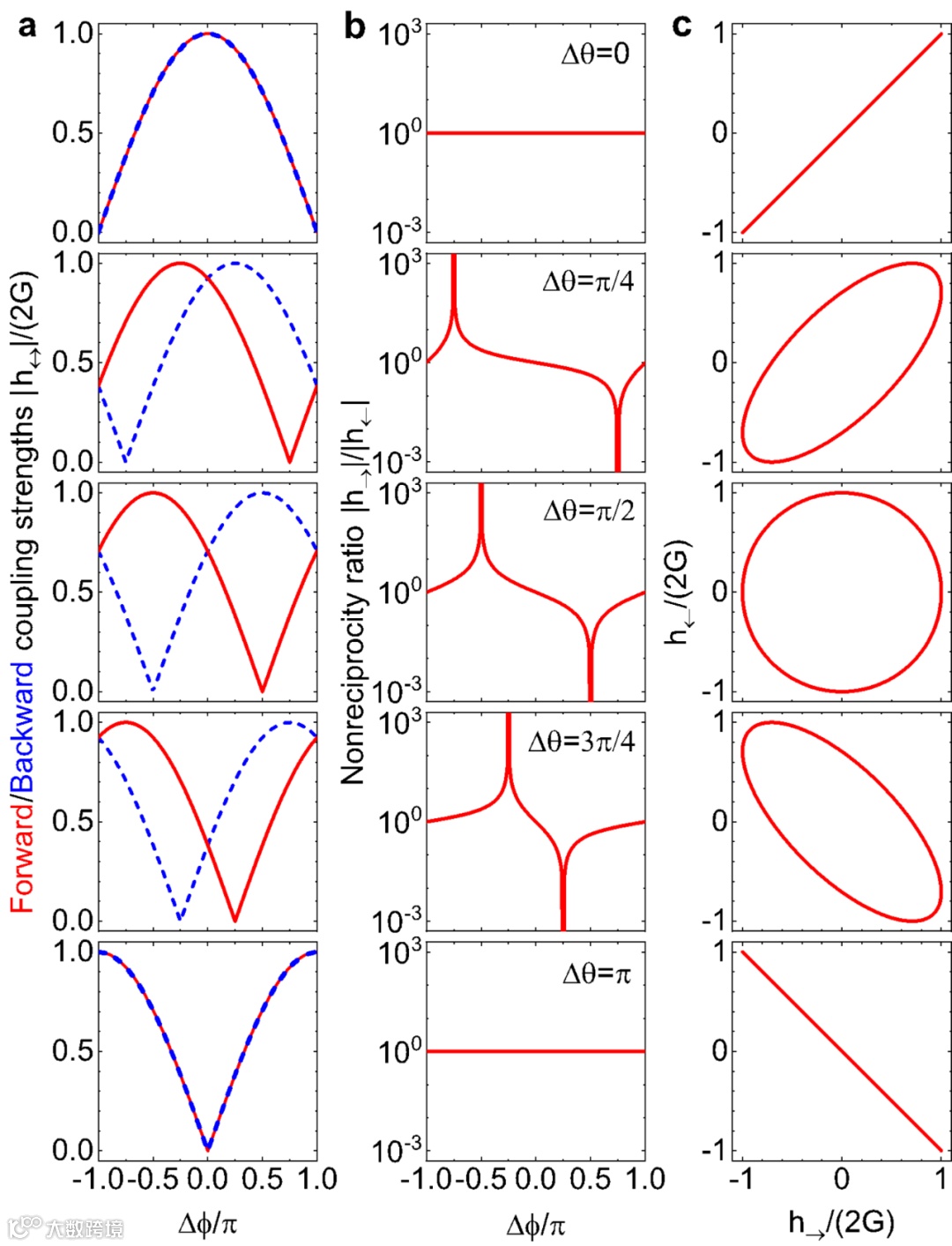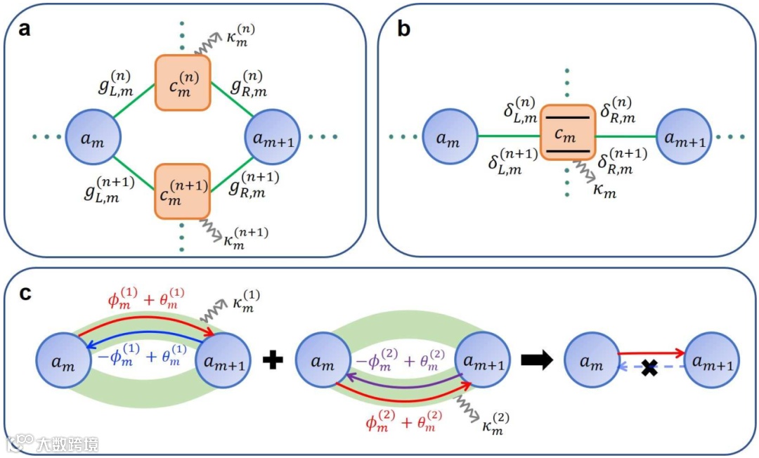 本文通过构建多个耗散通道干涉的模型,发现利用耗散引起的相位延迟结合多通道干涉,可有效地实现光学非互易。从图2所示的基本模型出发,考虑无直接相互作用的共振模式间由具有耗散的模式连接,通过绝热消除高耗散(或大失谐)的模式,得到共振模式间的等效耦合项,其耦合系数相位包含相干耦合相位和耗散相位两部分。由于耗散相位与能量传输方向无关,通过引入多个耗散模式使不同耗散通道间发生干涉,前向与后向的耦合强度在相位调控下产生差别。当调控相位满足一个方向耦合强度为0而另一个方向不为0时,系统可实现完全的光学非互易(图3)。
