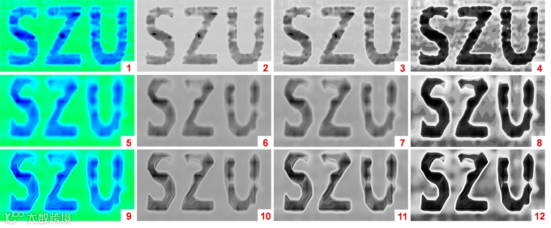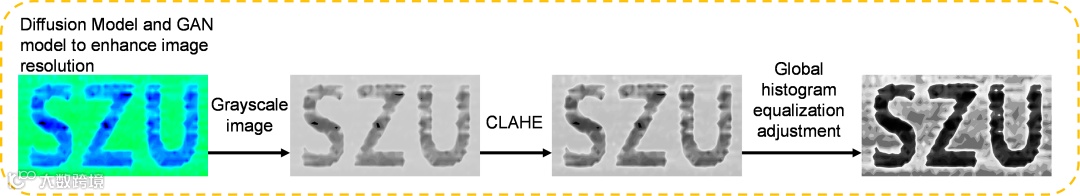 针对单像素成像中数据冗余与噪声干扰的难题,团队开发了一套AI驱动的自适应成像系统,融合对比度受限自适应直方图均衡化(CLAHE)、扩散模型(Diffusion Model)与生成对抗网络(GAN)三大技术。具体而言(图4 ):1. CLAHE预处理:通过局部直方图均衡化增强图像细节,将原始数据的对比度从0.227提升至0.890;2. 扩散模型降噪:利用去噪扩散概率模型(DDPM)消除低采样率(25%)下的随机噪声与模糊伪影;3. GAN超分辨率重建:基于条件生成对抗网络(GAN)将图像分辨率从730×394提升至2068×1104,边缘清晰度提高3倍。实验结果显示,该系统在低至25%的采样率下仍能重构出高保真图像(图5)。