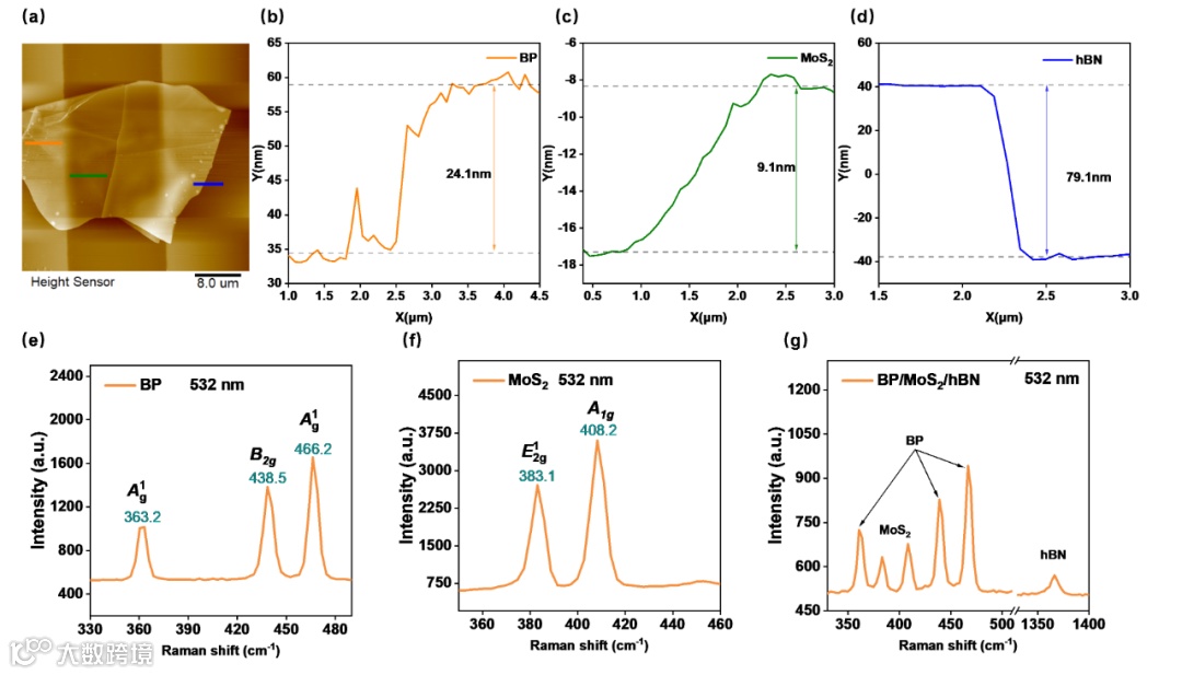 传统中红外探测器受限于材料带隙与载流子复合效率,难以兼顾宽光谱响应与高灵敏度。为此,团队设计了一种黑磷/二硫化钼/六方氮化硼(BP/MoS₂/hBN)范德华异质结,通过精确控制材料厚度(BP: 24.1 nm,MoS₂: 9.1 nm,hBN: 79.1 nm,图3)与界面能带匹配,构建了高效的II型异质结。实验表明,该异质结在负偏压下表现出显著的光电导效应,室温暗电流低至14.4 nA,且在3,390 nm中红外波段响应度达0.25A/W,比探测率(D*)达3.7*109 Jones(图2),性能超越多数同类器件。