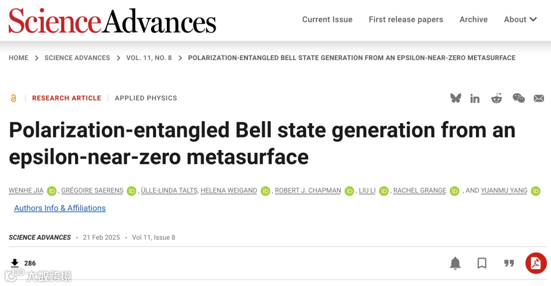 Wenhe Jia#, Grégoire Saerens#, Ülle-Linda Talts, Helena Weigand, Robert J. Chapman, Liu Li, Rachel Grange, Yuanmu Yang “Polarization-entangled Bell state generation from an epsilon-near-zero metasurface”. Science Advances 11, eads3576 (2025).