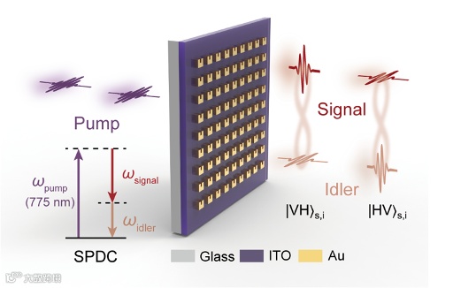 图1. 基于ENZ薄膜(ITO)和超构表面产生偏振纠缠Bell态光子对示意图