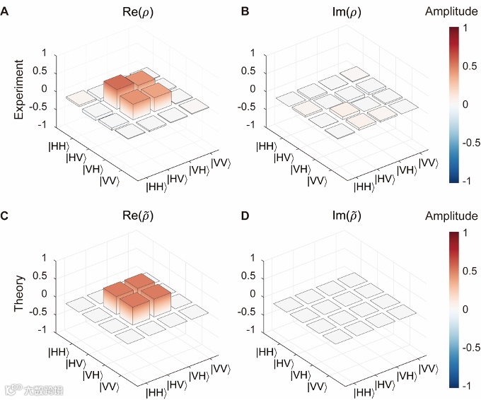 此外,研究团队通过设计等离激元超构表面的单元结构,实现了对其等效二阶非线性极化率张量的精准调控,从而能够精确控制纠缠光子对的偏振态。在x偏振光泵浦下,超构表面将生成一对偏振态正交的信号光(signal)和闲频光(idler),其中信号光的偏振态以相等概率呈现为x或y方向,而闲频光的偏振态则相应地呈现为y或x方向,满足偏振正交关系。为了完备表征ENZ超构表面产生光子对的偏振态,研究人员对其进行了偏振量子态层析测试,并重建了相应的态密度矩阵(图4A和B)。与理论预测的Bell态密度矩阵(图4C和D)相比,实验结果的保真度达到0.91,充分验证了该方案的可靠性。