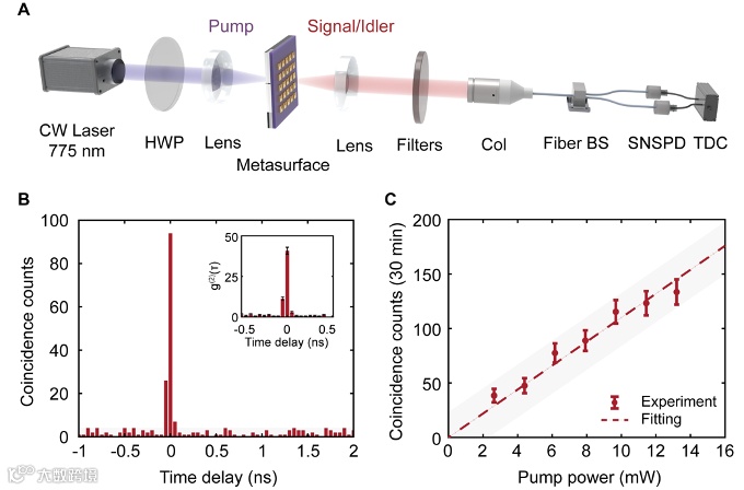 为了进一步验证ENZ超构表面能否有效辐射纠缠光子对,研究人员搭建了如图3A所示的Hanbury-Brown-Twiss(HBT)测试系统。通过连续波激光泵浦ENZ超构表面,研究人员获得了如图3B所示的符合计数直方图。在时间延迟τ = 0 ns处,符合计数出现明显峰值,证实ENZ超构表面能够有效生成纠缠光子对。根据计算,ENZ超构表面辐射光子的符合计数与随机计数比值(Coincidences-to-accidentals ratio,CAR)超过40,远高于经典光源的理论极限2,进一步证实了其发射光子的量子特性。为了探究纠缠光子对的产生机理,研究人员测量了光子对符合计数随泵浦功率的变化关系。实验结果如图3C所示,其变化趋势与SPDC过程的基本规律一致,进一步验证了ENZ超构表面作为高效量子光源的潜力。