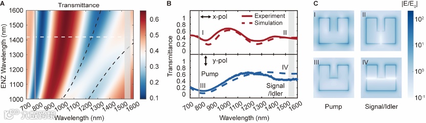 本研究旨在实现通信波段的偏振纠缠量子光源。为此,研究人员将纠缠光子对的中心波长设定为1550 nm,并选择其倍频波长775 nm作为泵浦波长。在超构表面的设计中,金属开口谐振环(Split-ring resonator,SRR)被选作基本谐振单元。为了提高纠缠光子对的产生效率,研究人员通过优化单元结构的形状和尺寸,构建了由超构表面与ITO薄膜组成的强耦合结构(图2A)。超构表面的透射率光谱如图2B所示,在SPDC过程的泵浦波长和光子对发射波长处均能支持谐振。同时,在ENZ效应的作用下,超构表面结构内部电场增强可达到两个数量级以上(图2C)。这种显著的电场增强效应能够有效提升非线性相互作用强度,从而显著提高SPDC过程的效率,增强纠缠光子对的产生。