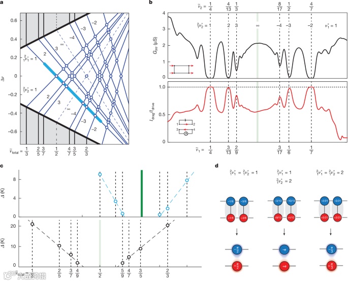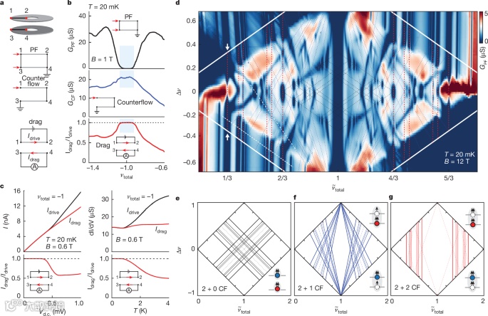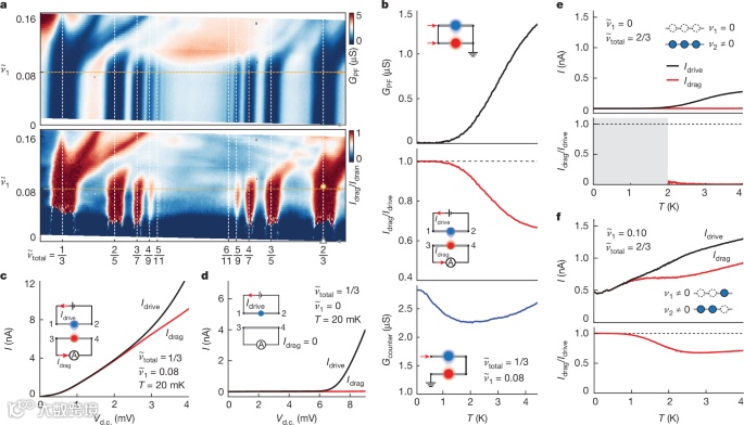 为了解决这一问题,布朗大学J. I. A. Li研究小组在激子与FQHE共存的研究中取得了新的突破。该团队通过在分数量子霍尔效应态中探测激子的配对行为,发现了两种新型的量子物态。首先,他们设计了在总整数填充因子下的完美拖曳实验,观察到激子凝聚体的存在,证实了激子在低温下形成凝聚体的现象。更重要的是,研究人员还在远离整数填充因子的情况下,发现了两类新的FQHE态,这些态表现出完美的拖曳响应,表明它们涉及分数激子的配对。其中,一类对应的是激子凝聚体的分数对应体,而另一类则与复合费米子态相对应,展现出具有分数统计的激子准粒子。