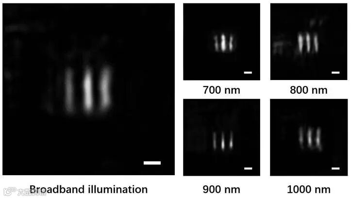为了制备出这样一种高性能消色差平面透镜,研究团队利用聚焦离子束刻蚀(FIB)、电子束曝光(EBL)及电感应等离子体刻蚀(ICP)等方法制备出SPDC层及超构原子层,从而制备出数值孔径为0.9、半径为20.1微米的消色差平面透镜(图2a)。测试结果表明,该平面透镜在650纳米至1000纳米的波长范围内具有很好的消色差聚焦性能(图2b)。他们还制备出数值孔径为0.7、半径为30.0微米的消色差平面透镜用于高分辨成像,图3展示了该透镜对USAF 1951分辨率板中第8组第6号条纹在不同波长的成像效果,获得了到目前为止分辨率最高(1.1微米)的消色差成像。