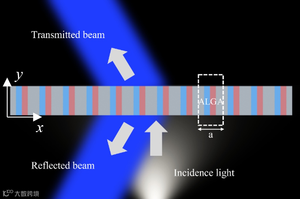更有意思的是,当前的结构周期单元是ALGA,根据图5d,我们把损耗层L和增益层G互换,变为AGLA,则模式P-和P+发生了交换,平面波由模式P+单向激发,与P-的方向相反。如果我们把整个光栅分为两半,左半段为AGLA,有半段为AGLA,由于两部分分别产生方向相反的单向辐射,结果形成交叉的两个辐射光束,结果如图8所示,进一步验证了结构的单向辐射的属性。不仅如此,辐射的光束能量远大于光源的能量。