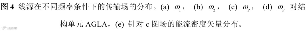 上述模式在k空间的不对称分布只是结构单向辐射的必要条件,而不是充分条件,因为模式的激发需要一定的条件。图4是频域仿真的结果,一线源放在结构的正下方,图4a,b是源频率分别为图2c中