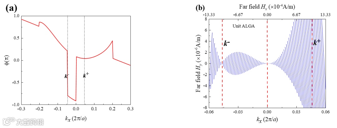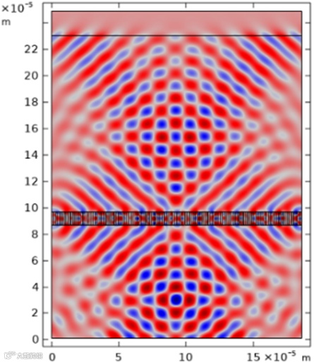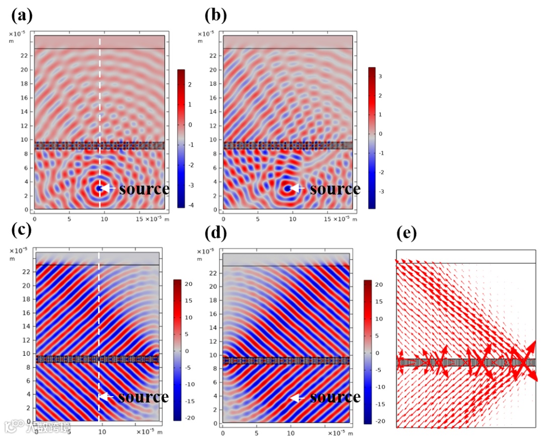 正好与模式k+和k-相交。虽然线源激发的发散光能保证波矢经过k+和k-,但很明显传输的波形基本上还是线源激发的柱面波,伴随有微弱的单向平面波的干涉图案,由该平面波扰动的方向判断该平面波由模式k-激发的辐射。随着频率增加到
