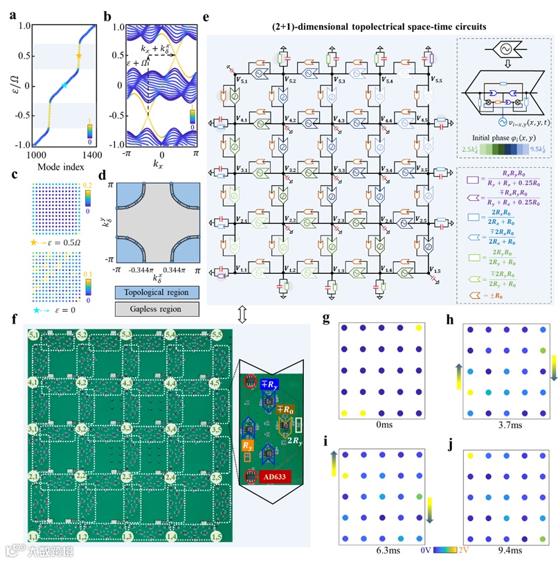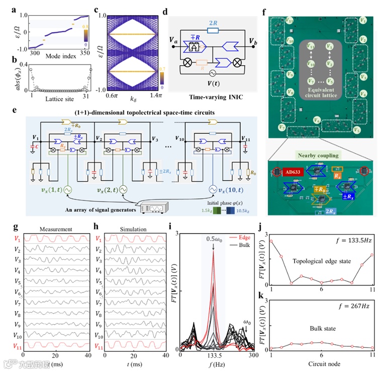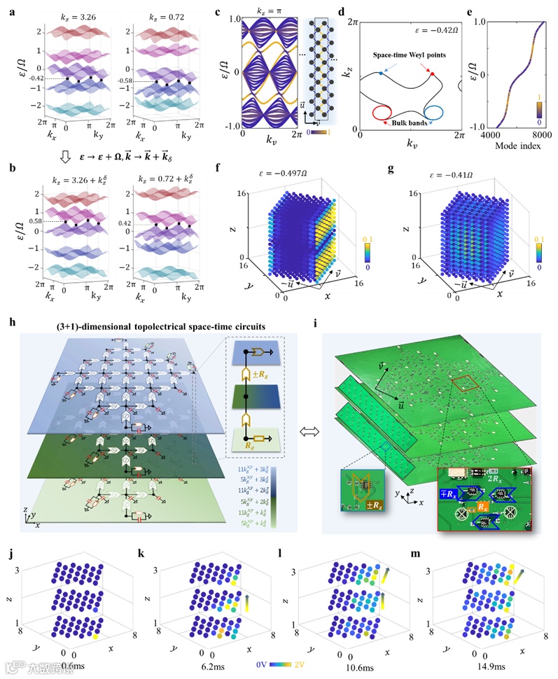的体态的空间分布。最后,研究人员设计并制备了(3+1)维拓扑空时电路(图3h-i),实现了对上述空时Weyl表面态的实验观测(图3j-3m)。