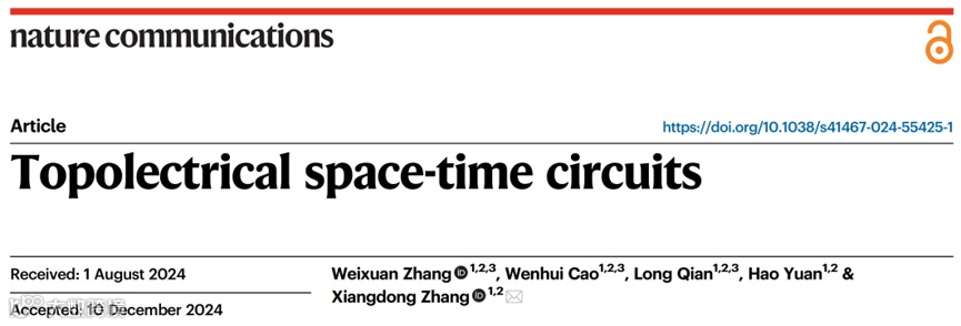 日前,北京理工大学物理学院张向东教授课题组,在拓扑电路研究方面取得重要进展。他们设计并制备出了一种新型空时电路,被称作“拓扑空时电路”,相关工作以“Topolectrical space-time circuits”为题发表在Nature Communications上[Nat. Commun. 16, 198 (2025)]。北京理工大学物理学院张蔚暄研究员和博士生曹汶慧、钱龙为论文的共同第一作者,张向东教授为通讯作者。研究工作得到国家重点研发计划和国家自然科学基金的大力资助。