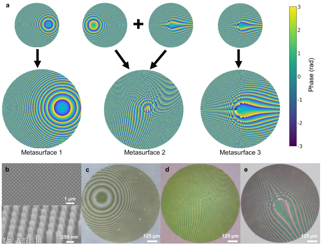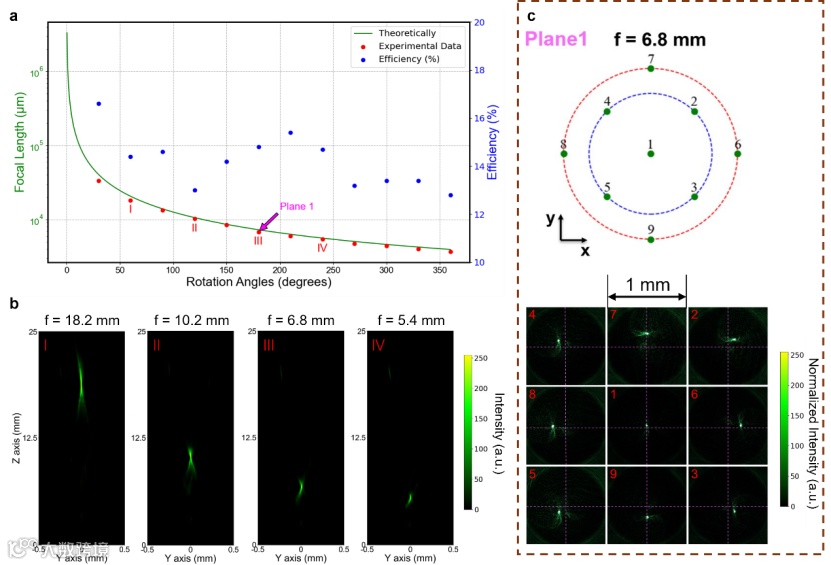 超构元件由三个级联的超表面组成,具体相位设计如图2a所示。三个超表面分别被定义为超表面1、超表面2和超表面3,利用莫尔理论能够通过相对旋转角度精确控制焦点位置。实验采用电子束光刻和刻蚀工艺在SiO₂基底上制备了直径为1 mm的TiO₂纳米柱阵列,其单元周期为300 nm,高度为800 nm。图2b展示了超表面纳米结构的扫描电子显微镜(SEM)图像,图2c-e分别为三个超表面的光学显微图像。