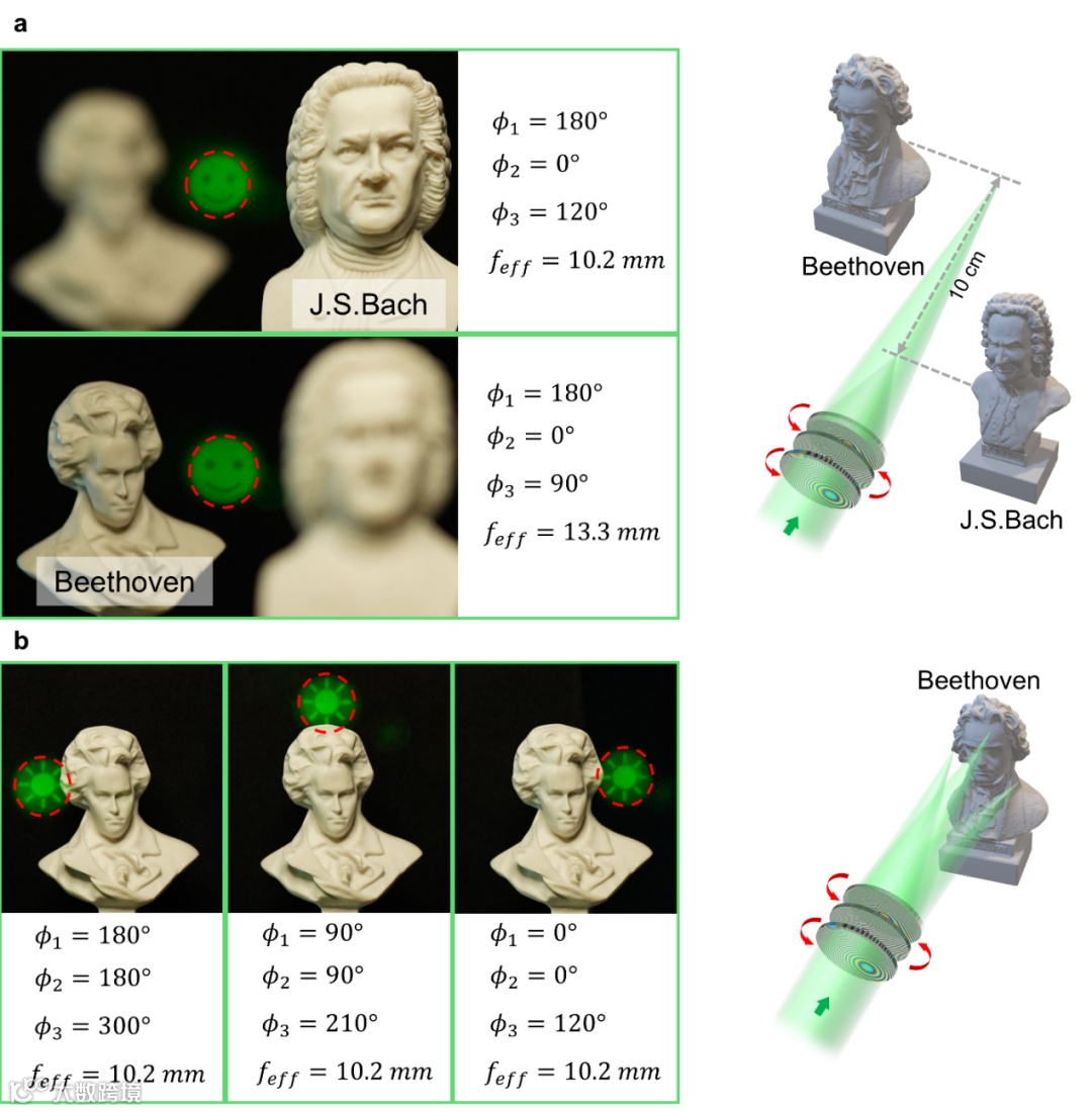 进一步,研究团队搭建了一个AR显示光学系统,将所提出的超构元件集成于其中,用于动态调节虚拟物体显示深度及扩大眼动范围。如图4a所示,通过调整超表面旋转角度,可将虚拟物体(红色虚线所示“笑脸”)精确聚焦于不同纵深位置上的真实物体(“巴赫”和“贝多芬”雕像)所在面。图4b展示了将虚拟物体(“太阳”)在横向平面自由移动至不同位置的能力,验证了器件在扩大眼动范围、实现瞳孔追踪方面的潜力。相较于传统方法,这种方法结构更加轻薄简洁,且未发现明显像差,适用于实际环境中的LED光源照明条件。
