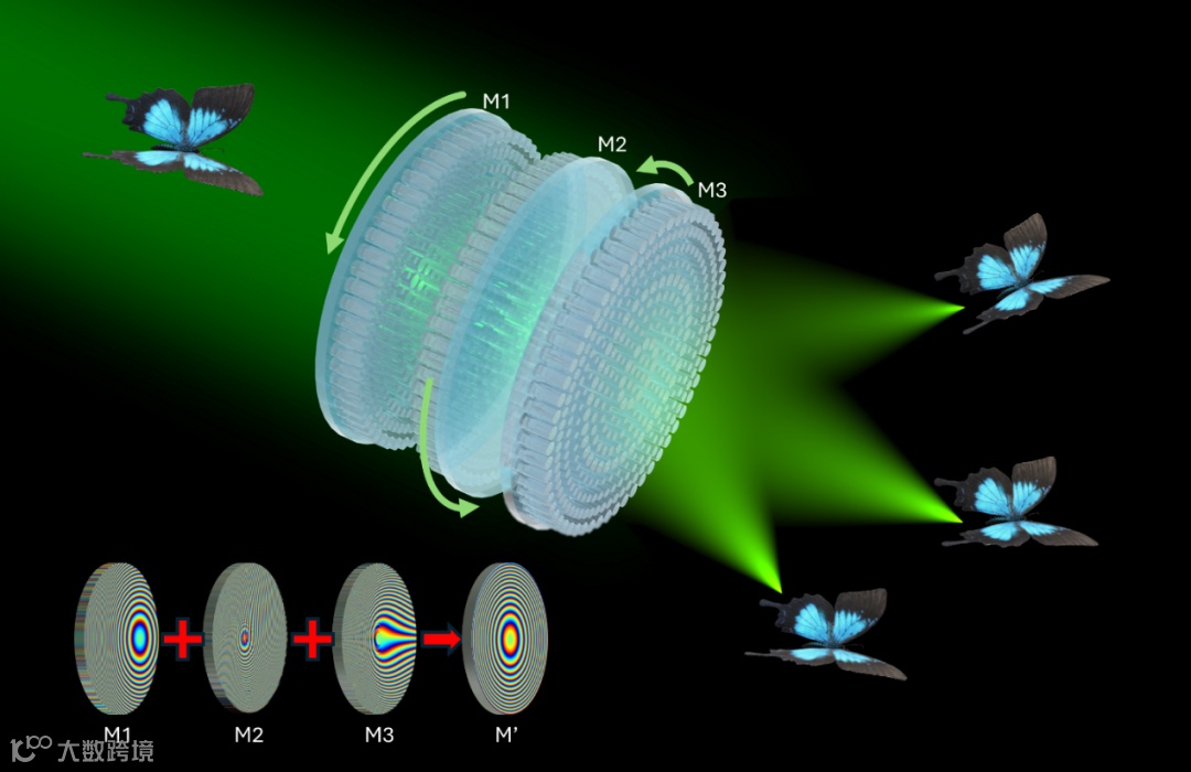 图1 三维可变焦超构元件操控焦点位置和显示的示意图。左下插图为特定相对旋转角度下三个超表面的合成聚焦相位。