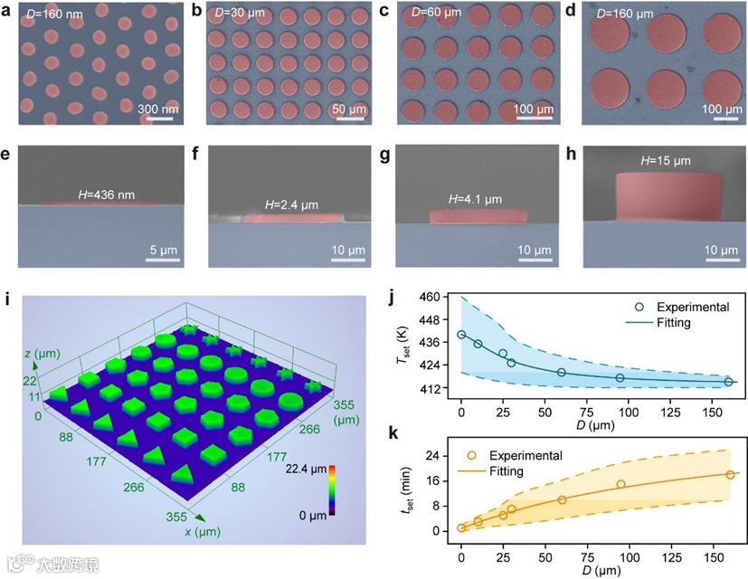 在压印过程中,PDMS不仅作为模板定型晶体形状,其多孔结构还在冷却阶段吸附过量熔体,消除微纳结构间的残留层,形成独立的图案化结构,避免结构间的串扰。通过模具的设计,有机晶体独立结构的形状、尺寸高度可调,具有纳米级表面粗糙度,满足光子器件对表面质量的严苛要求。(图3)