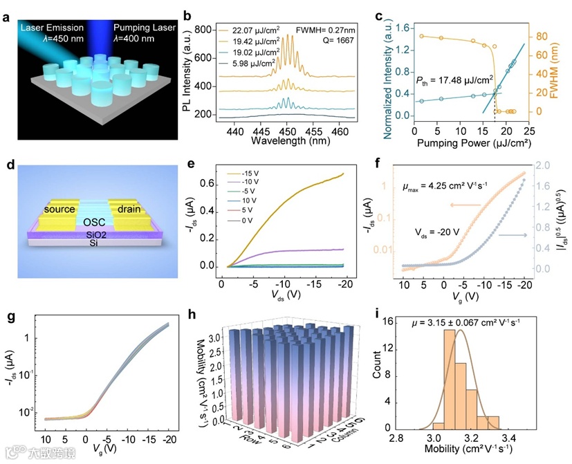 NICL技术具有良好的兼容性和普适性,可应用于多种不同的有机材料及混合有机材料的晶体图案化制备。利用NICL技术制备的微盘激光器兼具高Q值(1667)和低阈值(17.48 μJ/cm2)的优势。此外,利用NICL技术制备的场效应晶体管阵列的器件间差距低至2.12%,连续工作1000小时后,迁移率衰减<5%,表明了该技术在有机光电器件大规模制备中的优势。(图4,5)