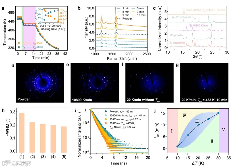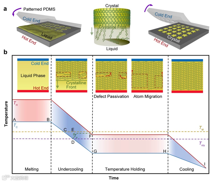 本研究中提出有机晶体的晶化压印技术(NICL),以有机粉末为原料,通过外部压力和毛细力使有机熔体在PMDS模板中成型。通过压印过程中严格的温度梯度控制,实现熔融态有机晶体结晶动力学的有效调控,促进晶体生长过程的缺陷自修复,降低晶体缺陷浓度,提升分子排布有序度。(图1)