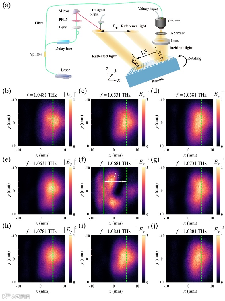 图4 (a) 用于测量LS的太赫兹场扫描成像系统的示意图。(b)-(j) 在不同频率下测得的反射光束的电场分布。绿色实线和绿色虚线分别表示在工作频率和参考频率(1.050 THz)下测得的反射光束的平均中心。
