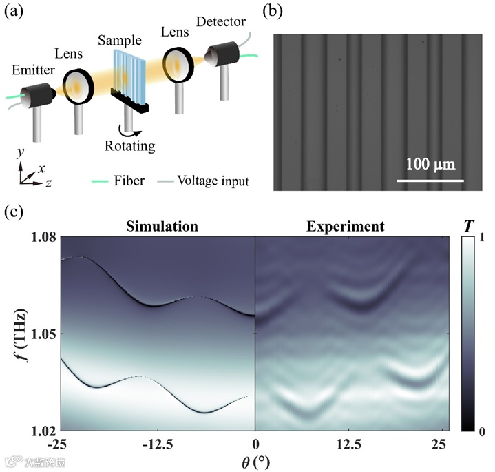 图3 (a) 4-f太赫兹时域系统的示意图。(b) 亚波长光栅−波导复合结构的显微图像。(c) 亚波长光栅−波导复合结构的仿真(左)与实验(右)测得的角分辨透射光谱。