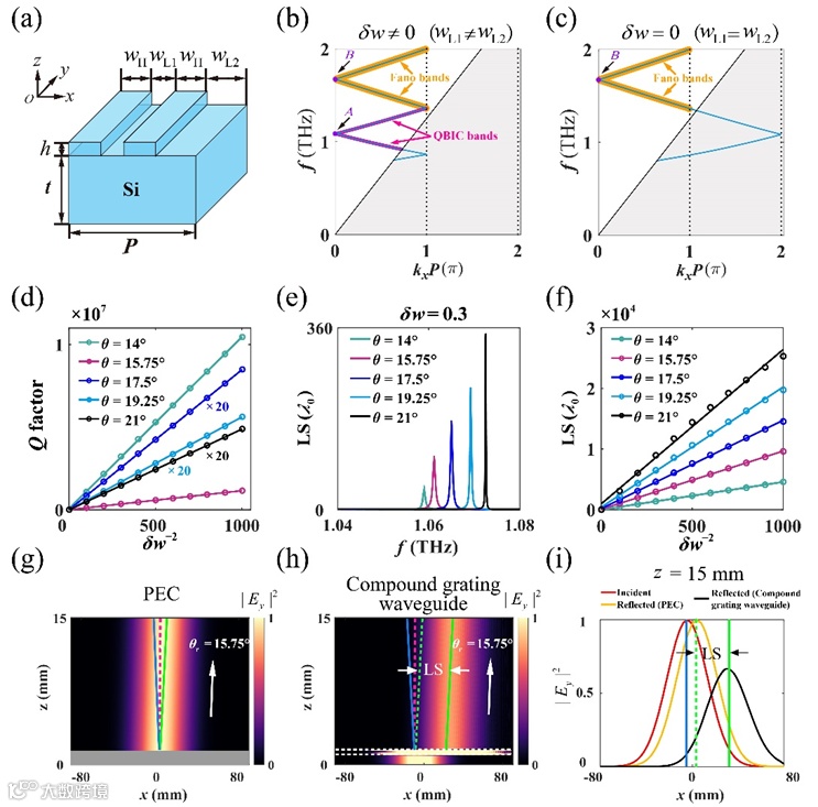 图2 (a) 亚波长光栅−波导复合结构的原胞示意图。(b) 当δw ≠ 0时,TE₉导模的折叠色散关系。(c) 当δw = 0时,TE₉导模的折叠色散关系。(d) 不同入射角下,QBIC的Q因子与几何参数δw⁻²的关系。圆点表示仿真得到的Q因子,实线为线性拟合曲线。(f) 不同入射角下,最大LS与几何参数δw⁻²的关系。(g) 入射角为θ = 15.75°,频率为1.0644 THz时,高斯光束被完美电导体(PEC,灰色区域)界面反射后的电场分布。(h) 在相同的入射条件下,高斯光束被亚波长光栅−波导复合结构反射后的电场分布。(i) 入射光束、被PEC反射的光束和被亚波长光栅−波导复合结构反射的光束在高度z = 15 mm处的电场分布。