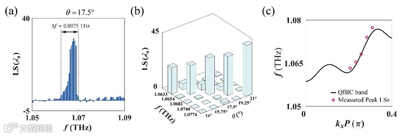 图5(a)给出了在1.05 ~ 1.09 THz频率范围内测量的LS。可见LS仅在极窄的频率范围内被显著增强。频率范围的宽度为 0.0075 THz,仅为QBIC频率的0.7%。这一极窄的频率范围表明,QBIC诱导的LS对频率极为敏感。实验结果表明,在特定的入射角下,LS会在QBIC频率处达到峰值。当频率稍微偏离QBIC频率时,LS会迅速下降至接近零,如图5(b)所示。通过测量LS的峰值频率,可表征QBIC能带,如图5(c)所示。